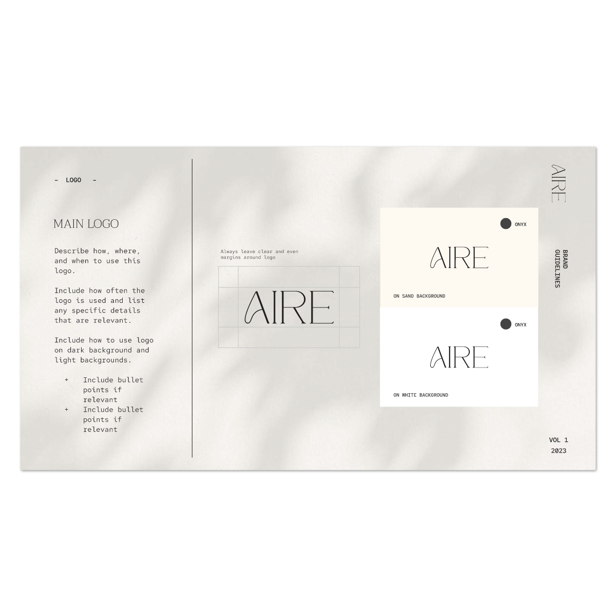 Introducing the AIRE Brand Guidelines deck: a fully customizable 56-slide Google Slides template with every slide we include for clients in our $10k+ branding projects. Covers all the information we cover throughout all 5 of our Essential Branding Kits.